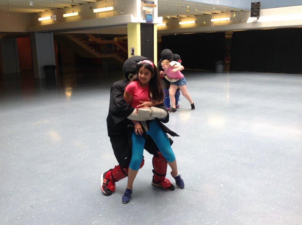 The children’s favorite part of the class is clearly the role-play, where Manoli, padded like a football player, tries out verballures on the children, grabs them,•and challenges them to show off what they’ve learned.